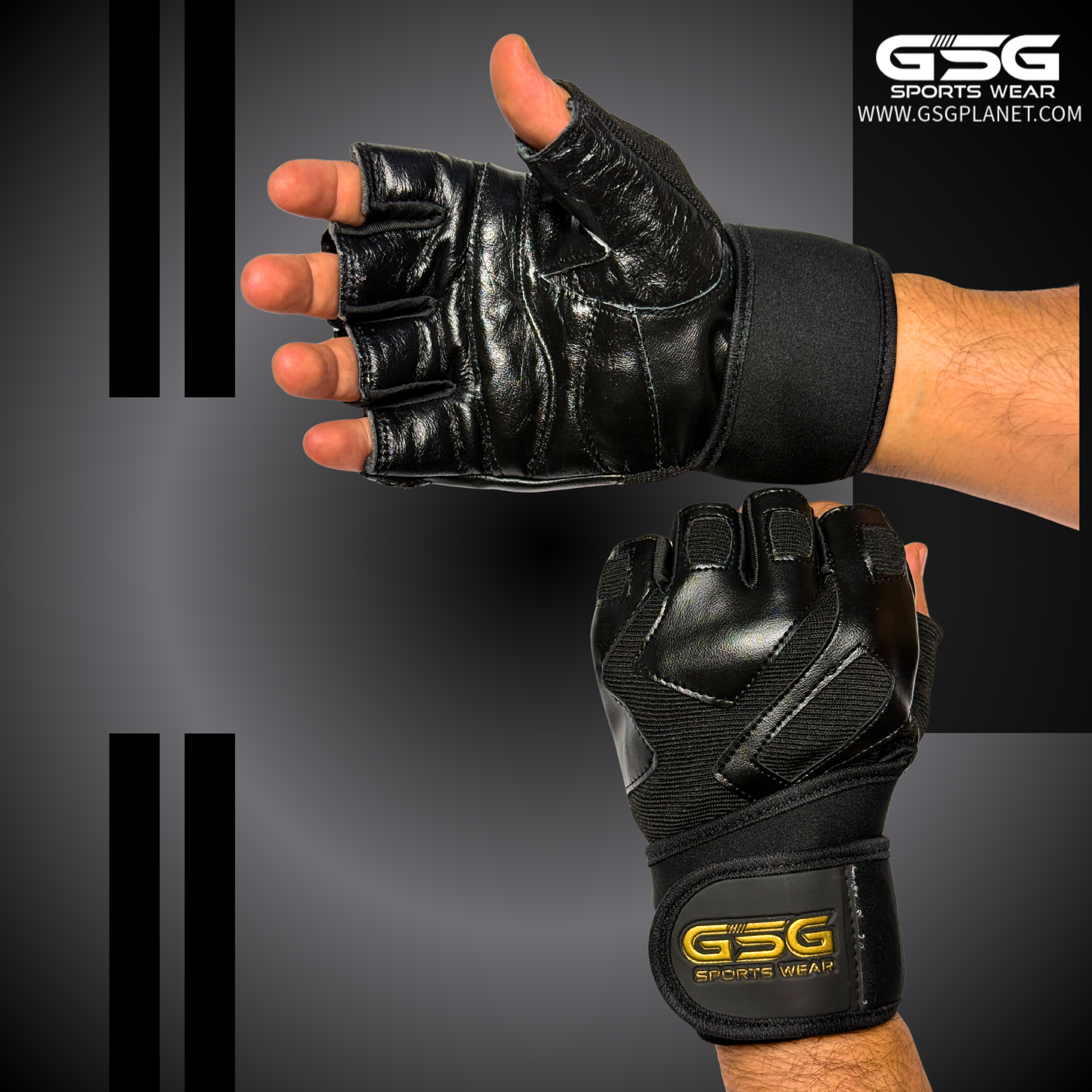GSG PowerGrip Leather Gym Gloves with Wrist Support – Black