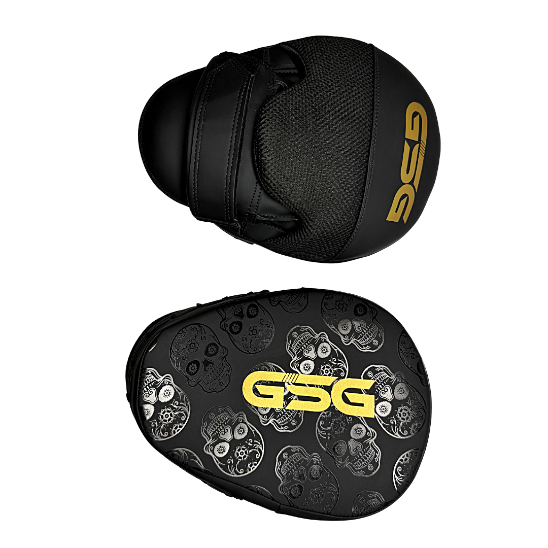 rain like a champion with the GSG Skull Strike Focus Pads, designed for precision, speed, and style. Featuring an aggressive skull pattern on a black base with striking gold GSG branding, these pads are built for both coaches and fighters who demand durability and comfort.