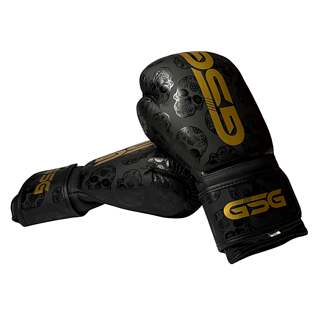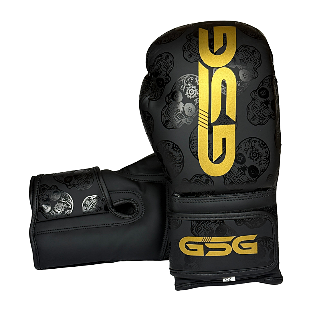 Step into the ring with the GSG Skull Strike Boxing Gloves, designed for fighters who want power, style, and durability. Featuring an edgy black base with subtle skull patterns and bold gold GSG branding, these gloves combine premium protection with a fierce look.
